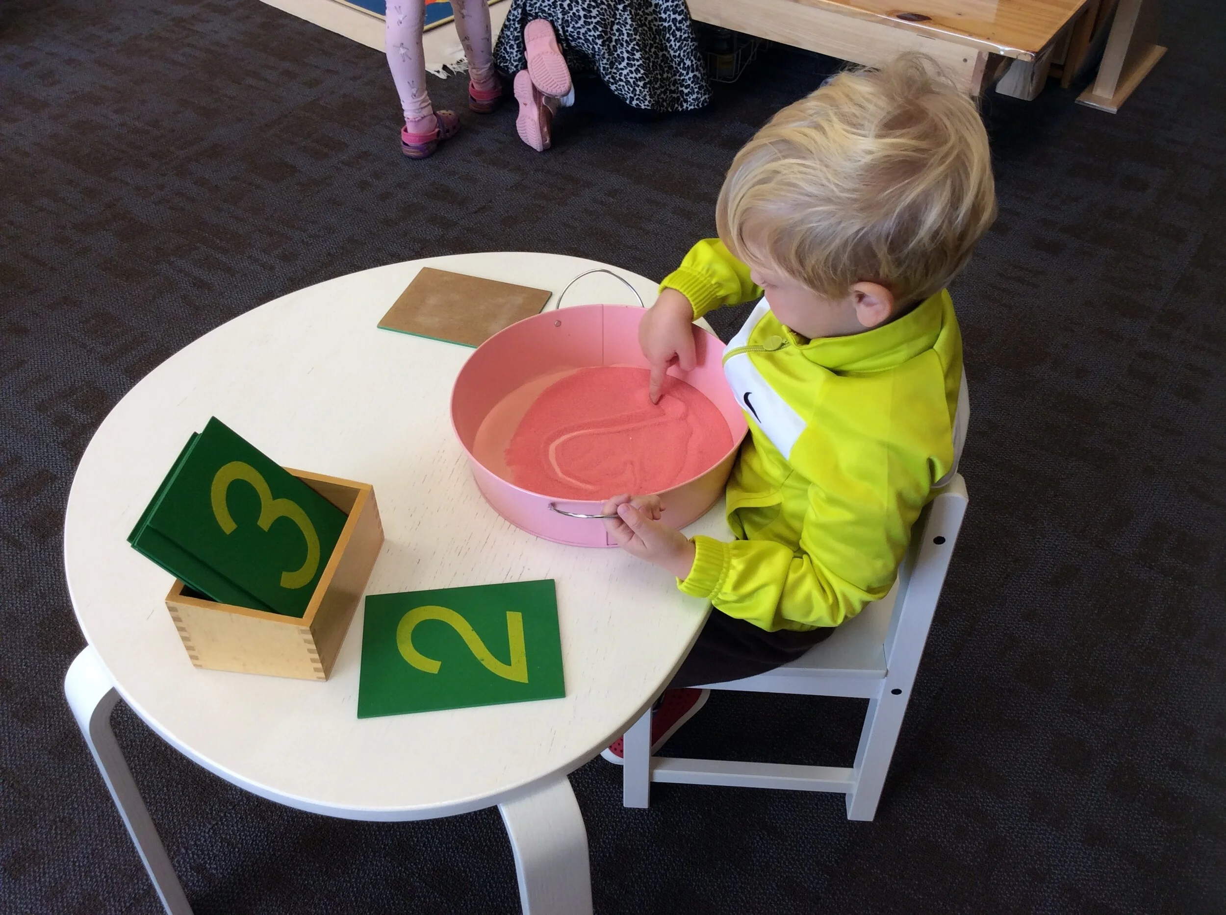 This area involves materials that are tactile, taking advantage of the 3 and 4 year olds child's sensitivity to learning through touch. The child is introduced to the names of the objects and then taught to recognize the letter sounds and beginning/ending/middle sounds. Writing often comes early to the Montessori child through the use of small objects and Moveable Alphabet, allowing the child to express his/her knowledge without needing precise control of the pencil. The child advances through the Pink, Blue, and Green materials at their own pace, then furthers their knowledge through learning parts of the sentence with grammar games. All children read Early Readers books by the time they are 6 and some advance to chapter books.
